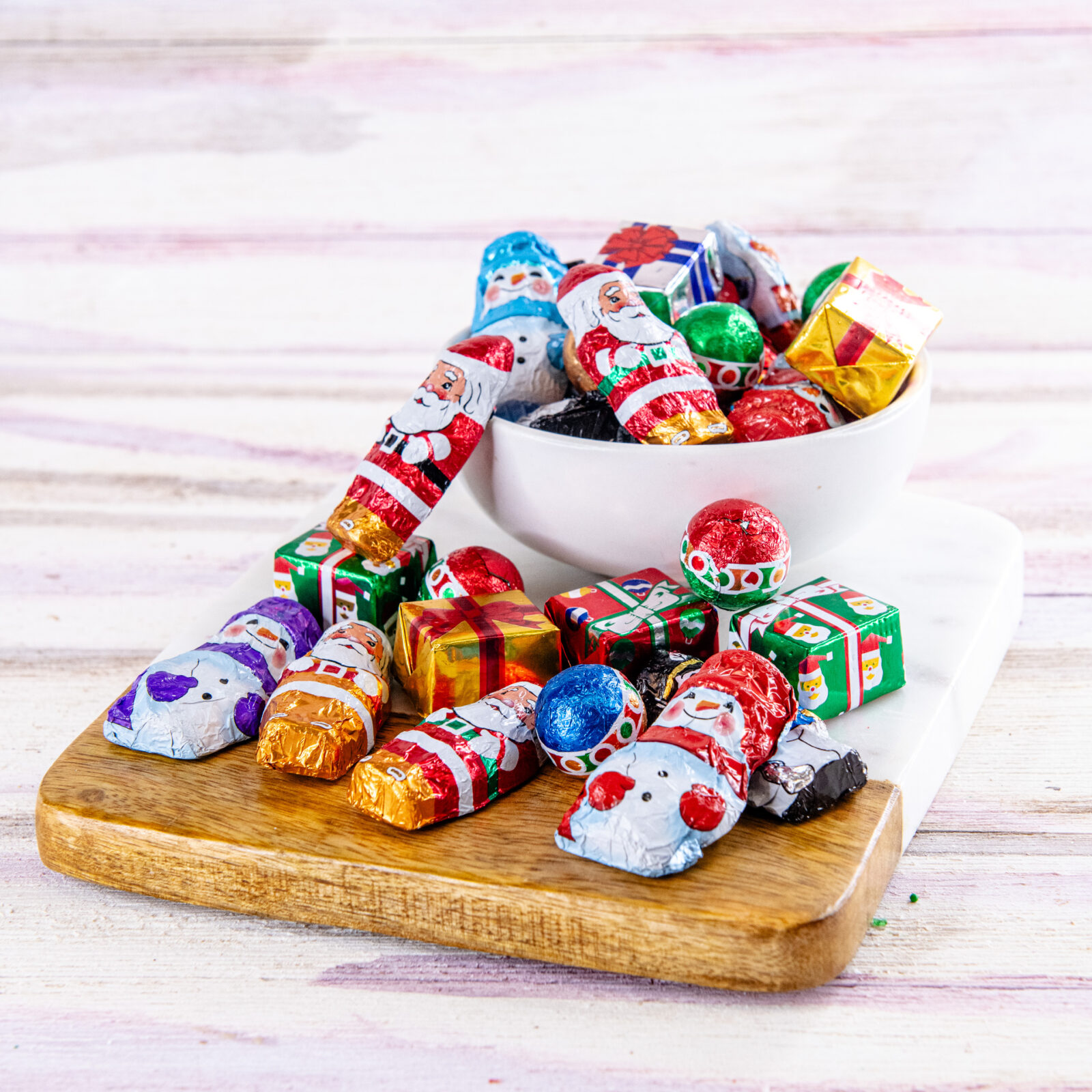 An assortment of solid milk chocolate santas, snowmen, balls and presents. Great for party favors , candy jars or Christmas stockings.