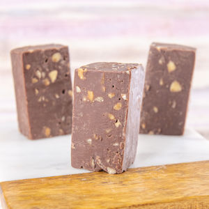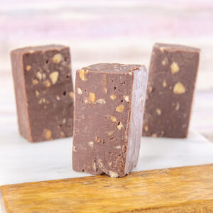 Our chocolate almond fudge is fresh and creamy, with chopped almonds mixed throughout.