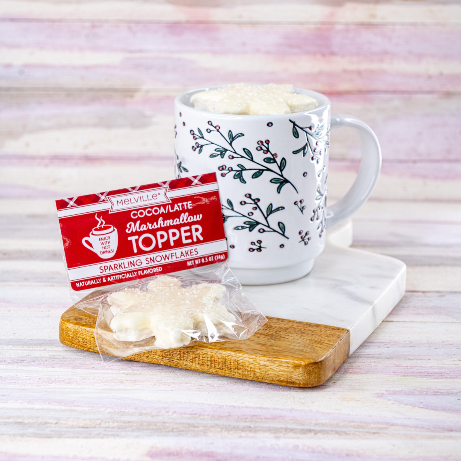 Snowflake Marshmallow Toppers are hand-dipped snowflake-shaped marshmallows sprinkled with clear crystal sugar. These are perfect for elevating your next cup of hot cocoa!
