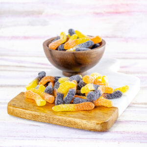 Things just got a little spooky! These creepy crawlers are dusted in sour sand and come in Lemon, Orange & Black Cherry flavors.