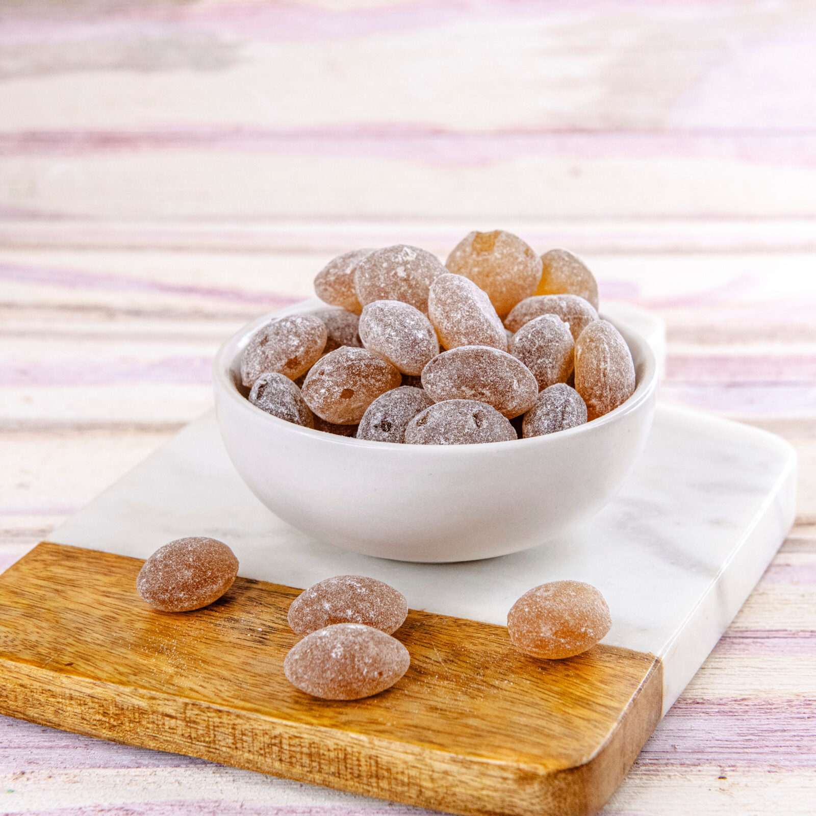 Sugar-sanded ginger hard candy is a sweet and spicy treat. Each piece has a hard shell that hides a strong ginger flavor. Its amber color and warm taste make it a classic favorite, perfect for sharing or enjoying alone.